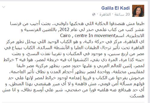 وأضافت: “الكتاب بيتباع في مصر من اربع سنين، وموجود في المكتبات وتقريبا نفذت النسخ، وبعثت جبته كذا مرة، المرة دي بقي، اكتشفوا إن فيه خريطة لمصر، هوا فيه ٣ خرائط لمصر، إثنين للعالم العربي وعليها حدود مصر، بتظهر مركزية مصر طبقًا لمقاييس مختلفة، وواحدة لمصر بتظهر أحجام المدن ونطاق تأثير العاصمة، مرضوش يفرجوا عن الكتاب وقرروا إعدامه لوجود خرائط لمصر لإنها علي حد قولهم مسألة أمن قومي، مش فاهمة ولا أي مبرر هيقنعني بهذا المنطق، وأي حد هيدافع عنه هلغيه فورا من صفحتي، شير على أوسع نطاق، وأنا مش هسكت”.
