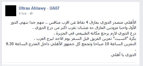 نشرت الصفحة الرسمية لألتراس أهلاوي بموقع التواصل الاجتماعي “فيس بوك” بيانا أكد فيه دعمه لفريقه في المباريات القادمة من أجل الحصول على الدوري المصري.