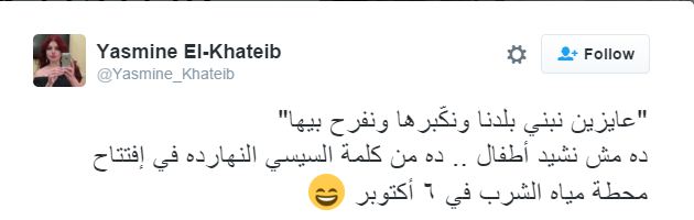 Yasmine El-Khateib: “عايزين نبني بلدنا ونكّبرها ونفرح بيها”.. ده مش نشيد أطفال .. ده من كلمة السيسي النهارده في إفتتاح محطة مياه الشرب في ٦ أكتوبر”