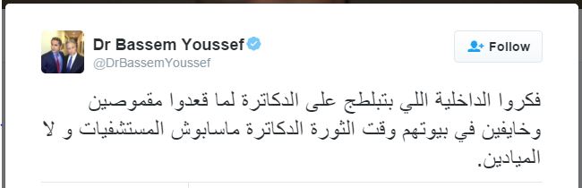 هاجم مقدم البرامج الساخر باسم يوسف، اعتداء أمناء الشرطة على أطباء مستشفى المطرية، وذلك من خلال تغريدة نشرها عبر حسابه الشخصي بموقع التغريدات القصيرة "تويتر"