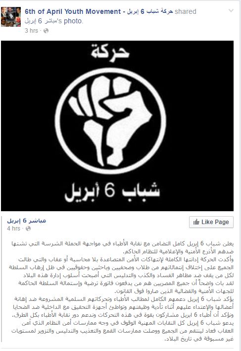 أعلنت حركة شباب 6 أبريل تضامنها مع النقابة العامة لأطباء مصر، بعد تعرض أطباء مستشفى المطرية التعليمي لاعتداء غاشم من بعض أمناء الشرطة التابعين لوزارة الداخلية المصرية