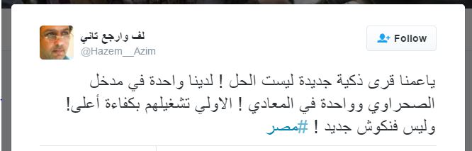 وأوضح عبدالعظيم أنه من باب أولى أن يهتم بكفاءة القرى القديمة، ولا ينشئ قرى أخرى جديدة ليكمل بها عددا دون فائدة أو إنتاجية نافعة، ووصف هذه القرية بـ”فنكوش جديد”. وأوضح في تغريدة أخرى أن السيسي لا يسمع إلا صوت المؤيدين له فقط، مشيرا إلى عدم استماعه إلى نصائح الدكتور حسين الجريتلي الذي استقال اعتراضا على المشروع.
