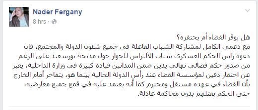 هاجم أستاذ العلوم السياسية الدكتور نادر فرجاني، دعوة السيسي لأولتراس النادي الأهلي للحوار ومباشرة التحقيقات في أحداث مجزرة بورسعيد، وذلك خلال تعليق نشره عبر حسابه الشخصي بموقع التواصل الاجتماعي “فيس بوك”.