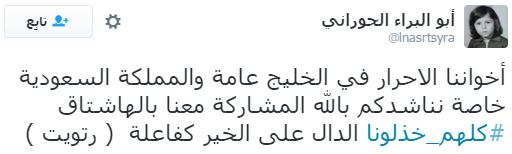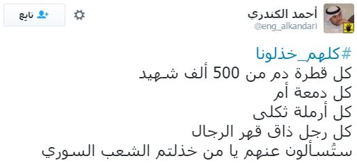 تصدّر هاشتاج “#كلهم_خذلونا” موقع التواصل الاجتماعي “تويتر”، وغرّد عليه العديد من النشطاء السوريين، والكثيرين من الوطن العربي، تضامنًا مع الشعب السوري، وضد التخاذل العربي لسوريا.