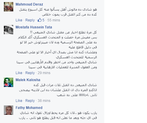 وسخر النشطاء من الخبر؛ حيث إنها ليست المرة الأولى التي يعلن فيها مقتل المنيعي؛ حيث أعلن المتحدث العسكري، في أكثر من مرة، مقتل المنيعي، وبعدها يخرج المنيعي في إحدى عمليات تنظيم الدولة في سيناء.