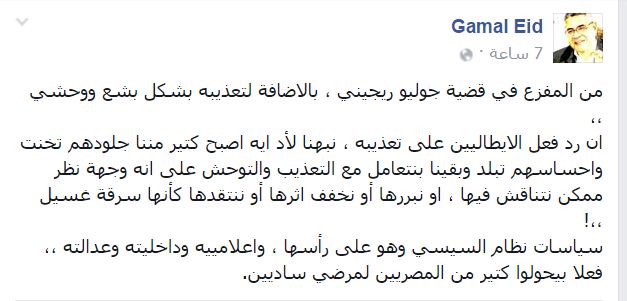 قارن الناشط الحقوقي، جمال عيد، بين رد فعل الإيطاليين على تعذيب الباحث الإيطالي، وتعامل المصريين ووسائل الإعلام مع تلك الأنواع من القضايا على أنها هينة.
