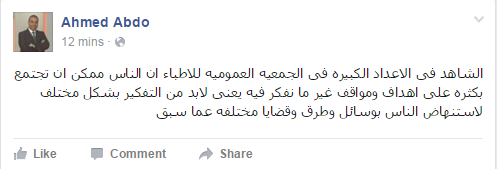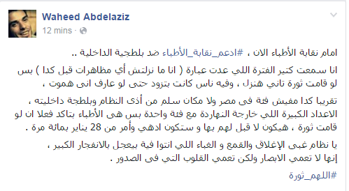 وكتب الناشط وحيد عبد العزيز :” أنا سمعت كثير الفترة اللي عدت عبارة ( انا ما نزلتش أي مظاهرات قبل كدا ) بس لو قامت ثورة ثاني هنزل ، وفيه ناس كانت بتزود حتى لو عارف أنى هموت، تقريبا كدا مفيش فئة فى مصر ولا مكان سلم من أذى النظام وبلطجة داخليته ، الاعداد الكبيرة اللي خارجة النهاردة مع فئة واحدة بس هي الأطباء بتأكد فعلا أن لو قامت ثورة ، سيكون لا قبل لهم بها و ستكون ادهي وأمر من 28 يناير بمائة مرة”.