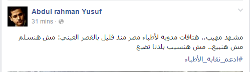 وعلق الشاعر عبد الرحمن يوسف :”مشهد مهيب.. هتافات مدوية لأطباء مصر منذ قليل بالقصر العيني: مش هنسلم مش هنبيع.. مش هنسيب بلدنا تضيع”.