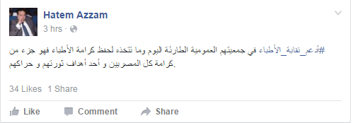و قال المهندس حاتم عزام : “#أدعم_نقابة_الأطباء في جمعيتهم العمومية الطارئة اليوم وما تتخذه لحفظ كرامة الأطباء فهو جزء من كرامة كل المصريين و أحد أهداف ثورتهم و حراكهم”.
