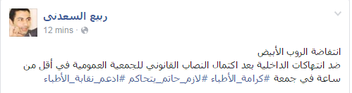 وقال الناشط ربيع السعدني: انتفاضة الروب الأبيض ضد انتهاكات الداخلية بعد اكتمال النصاب القانوني للجمعية العمومية في أقل من ساعة في جمعة #كرامة_الأطباء