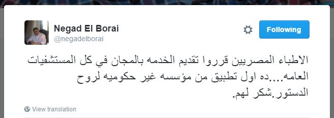 علق المحامي الحقوقي نجاد البرعي على قرار نقابة الأطباء بمنع تحصيل رسوم من علاج المواطنين بالمستشفيات الحكومية بأنها بذلك القرار تعد أول مؤسسة غير حكومية تطبق روح الدستور في مصر، وذلك عبر صفحته الشخصية بموقع التواصل الاجتماعي “فيس بوك”.