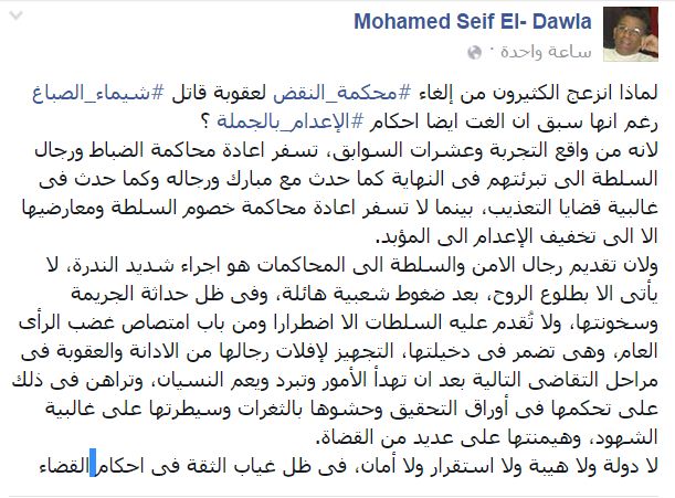 وتساءل -عبر منشور له على “فيس بوك”-: “لماذا انزعج الكثيرون من إلغاء ‫‏محكمة النقض‬ لعقوبة قاتل ‫‏شيماء الصباغ‬، رغم أنها سبق أن ألغت أيضًا أحكام ‫‏الإعدام بالجملة؟”.