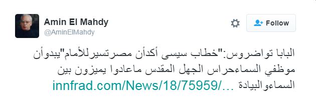 وعلق مغردون على تصريحات “تواضروس” بأن مصر تسير للأمام، بتعليقات ساخرة، وكان من بينها.. حمد ماهر: البابا تواضروس: خطاب السيسي أكد أن مصر تسير للأمام.. دايما فيه ناس بتنصحني إني ما استخدمش ألفاظ بذيئة طب ده يتقال له ايه؟؟