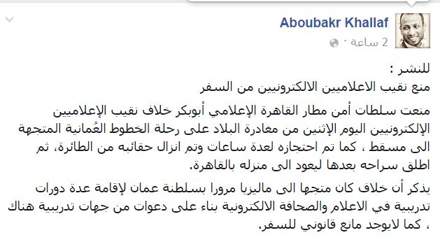وقال -في بيان نشره عبر صفحته على “فيس بوك”-: “منعت سلطات أمن مطار القاهرة الإعلامي أبوبكر خلاف نقيب الإعلاميين الإلكترونيين اليوم الإثنين، من مغادرة البلاد على رحلة الخطوط العُمانية المتجهة إلى مسقط”.