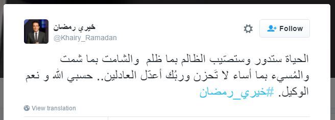 علق المذيع خيري رمضان على قرار منعه من الظهور على القنوات الفضائية مؤقتًا، بقوله "حسبي الله ونعم الوكيل"، وذلك خلال تغريدة نشرها عبر حسابه الشخصي بموقع التغريدات القصيرة "تويتر"