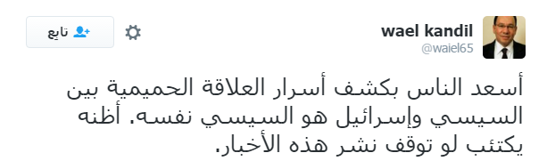 بداية، أكد الكاتب الصحفي وائل قنديل على أن سعادة عبد الفتاح السيسي تنبع من تداول تلك الأخبار.
