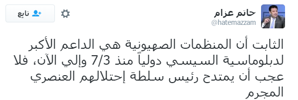 وكشف البرلماني السابق حاتم عزام أن الداعم الأكبر لدبلوماسية السيسي دوليا هي المنظمات الصهيونية.