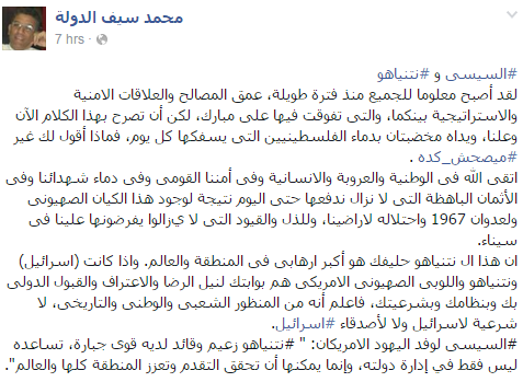 وشدد الباحث السياسي محمد سيف الدولة على أن السيسي تفوق على مبارك في التحالف مع “إسرائيل”، وذلك من خلال تعليق نشره عبر صفحته الشخصية بموقع التواصل الاجتماعي “فيس بوك”.