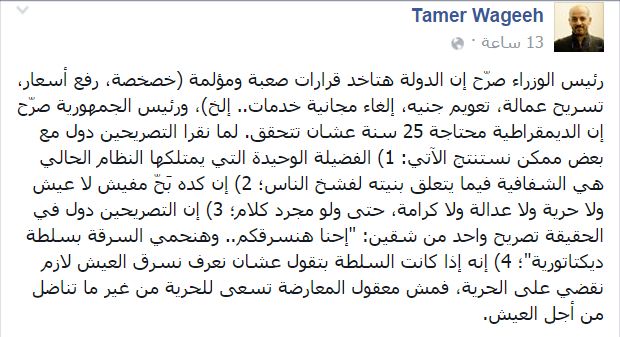 انتقد تامر وجيه، الكاتب والناشط الاشتراكي، تصريحات رئيس الوزراء، بأن الدولة ستتخذ قرارات صعبة ومؤلمة، وتصريحات عبدالفتاح السيسي بأن الديمقراطية ستحتاج 25 سنة لكي تتحقق.