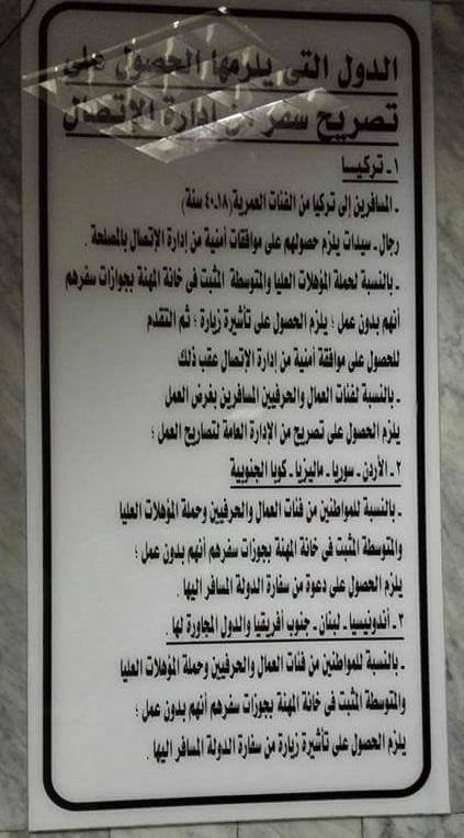 تشترط السلطات المصرية على مواطنيها حصول تصريحات من مصلحة الجوزات بمجمع التحرير، قبل السفر إلى 16 دولة، حيث يتجه المواطن إلى مبنى المجمع للحصول على الإذن وإعطاء مبررات السفر.