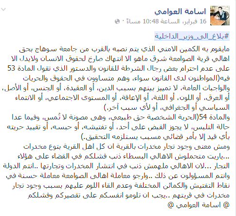 وكتب أحد مواطني القرية، أسامة العوامي، عبر الهاشتاج يقول: “ما يقوم به الكمين الأمني الذي يتم نصبه بالقرب من جامعة سوهاج بحق أهالي قرية الصوامعة شرق، ما هو إلا انتهاك صارخ لحقوق الإنسان ولا يدل إلا على عدم احترام بعض رجال الشرطة للقانون والدستور الذي تقول المادة 53 فيه (المواطنون لدى القانون سواء، وهم متساوون في الحقوق والحريات والواجبات العامة، لا تمييز بينهم بسبب الدين، أو العقيدة، أو الجنس، أو الأصل، أو العرق، أو اللون، أو اللغة، أو الإعاقة، أو المستوى الاجتماعي، أو الانتماء السياسي أو الجغرافي، أو لأي سبب آخر)..