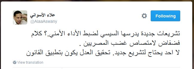 وصف الروائي والكاتب علاء الأسواني تصريحات السيسي بأنه يدرس تشريعات جديدة لضبط الداخلية، والتي أدلى بها عقب حادث مقتل شاب بمنطقة الدرب الأحمر على يد أمين شرطة، بالحديث الفضفاض.
