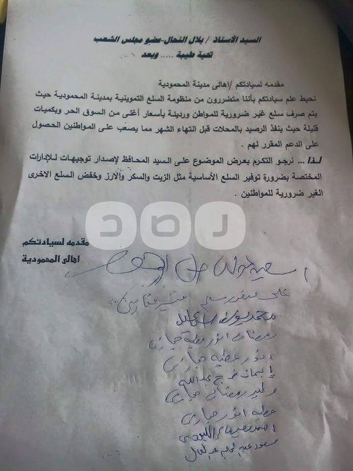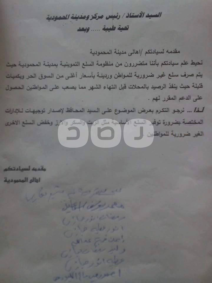 وأرسل الأهالي عدة شكاوى لرئيس المدينة وعضو مجلس الشعب عن مركز المحمودية، لكن دون جدوى؛ حيث أفادت تلك الشكاوى رغبة الأهالي في الحصول على السلع الأساسية مثل “الزيت، والأرز، والسكر”، والتي لا تتوفر بسهولة في مكاتب التموين ومقرات التوزيع.