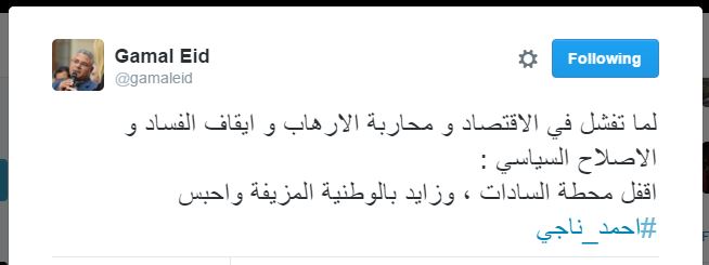 سخر الناشط الحقوقي جمال عيد من حكم حبس الصحفي أحمد ناجي، وذلك من خلال تغريدة نشرها اليوم عبر حسابه الشخصي بموقع التغريدات القصيرة “تويتر”.