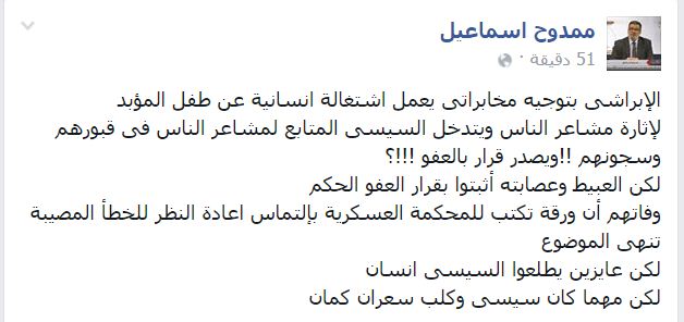وقال -عبر منشور له على “فيس بوك”-: “اﻹبراشي بتوجيه مخابراتي يعمل اشتغالة إنسانية عن طفل المؤبد ﻹثارة مشاعر الناس ويتدخل السيسي المتابع لمشاعر الناس في قبورهم وسجونهم!! ويصدر قرارًا بالعفو!!!؟”.