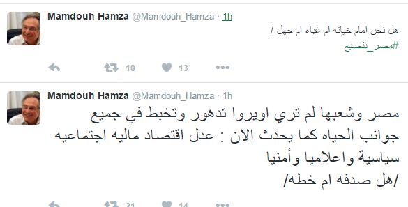وتساءل “حمزة” في نهاية تغريدته قائلا: “هل صدفة أم خطة؟”، متسائلا أيضا في تغريدة أخرى: “هل نحن أمام خيانة أم غباء أم جهل؟”، وأتبعها بهاشتاج #مصر_ بتضيع.