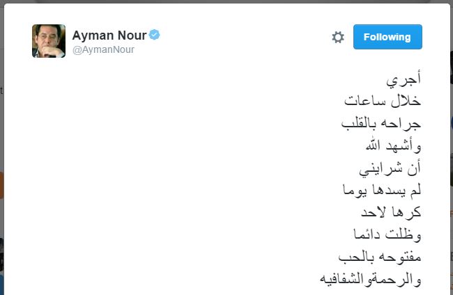 أكد الدكتور أيمن نور رئيس قناة الشرق الفضائية، أنه سيجري عملية جراحية فى القلب، وذلك من خلال تغريده نشرها عبر حسابه الشخصي بموقع التغريدات القصيرة "تويتر".