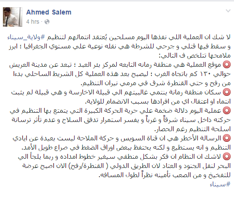 واستنتج أستاذ البيولوجي أن التنظيم يملك حرية الحركة بشكل كبير داخل سيناء شرقًا وغربًا، لافتًا إلى أن تلك العملية تُفسر استمرار تَدفق السلاح، وعدم تأثر ترسانة أسلحة التنظيم رغم الحصار.