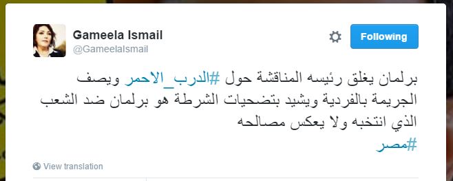 وقالت جميلة إسماعيل في تغريدتها: “البرلمان يعمل ضد الشعب، ولا يعكس مصالحه، وذلك بعد أن أغلق رئيس برلمان السيسي، مناقشة قتيل الدرب الأحمر على يد أمين شرطة، وأشاد بدور أمناء الشرطة المصرية”.