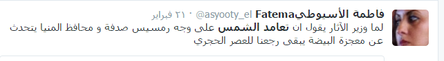 فاطمة الأسيوطي: “لما وزير الآثار يقول إن تعامد الشمس على وجه رمسيس صدفة ومحافظ المنيا يتحدث عن معجزة البيضة يبقى رجعنا للعصر الحجري”.