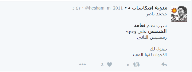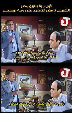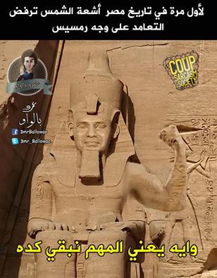 سخر رواد موقع التواصل الاجتماعي “فيس بوك” ومغردو موقع التدوين المصغر “تويتر” من رفض أشعة الشمس التعامد على وجه تمثال رمسيس بمعبد أبوسمبل لأول مرة في التاريخ، وهو الحادث الذي عللت الحكومة عدم حدوثه بسبب سوء الأحوال الجوية.