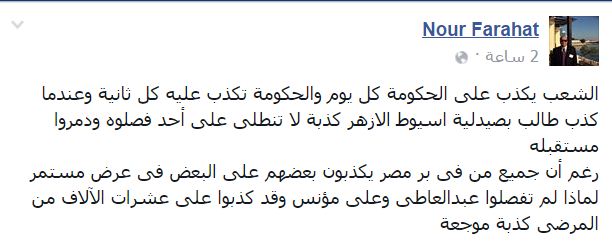 وقال -عبر منشور له على “فيسبوك”-: “الشعب يكذب على الحكومة كل يوم والحكومة تكذب عليه كل ثانية، وعندما كذب طالب بصيدلة أسيوط الأزهر كذبة لا تنطلي على أحد، فصلوه ودمروا مستقبله، رغم أن جميع من في برّ مصر يكذبون بعضهم على البعض في عرض مستمر”.