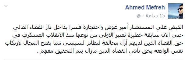 واعتبر -عبر منشور له على “فيسبوك”- أن احتجاز المستشار قسرا بداخل دار القضاء العالي سابقة خطيرة تعتبر الأولى من نوعها منذ الانقلاب العسكري في حق القضاة الذين لديهم آراء مخالفة لنظام السيسي”.