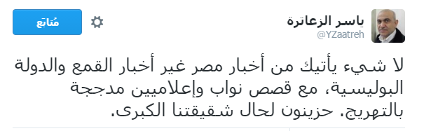وأشار الزعاترة في تغريدة له عبر حسابه الرسمي على موقع التواصل الاجتماعي “تويتر” إلى “التدفق المستمر لأخبار القمع والدولة البوليسية بمصر مع قصص لنواب وإعلاميين مدججة بالتهريج”، على حد وصفه.