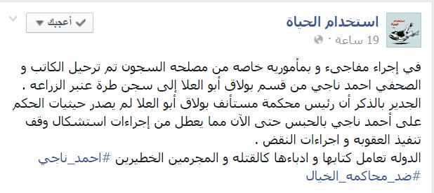 وقالت الصفحة -عبر منشور لها على “فيس بوك”-: “في إجراء مفاجئ وبمأمورية خاصة من مصلحة السجون تم ترحيل الكاتب والصحفي أحمد ناجي من قسم بولاق أبو العلا إلى سجن طره عنبر الزراعة”.