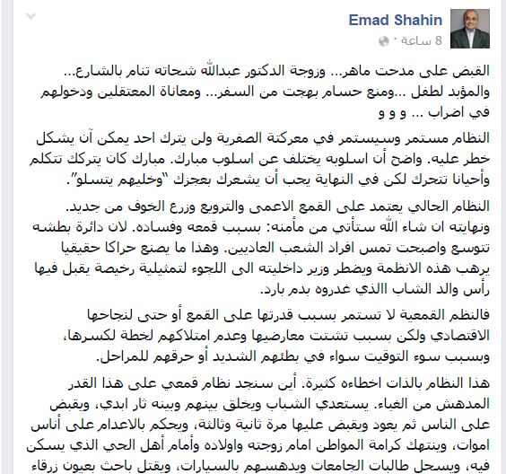 وأعرب “شاهين” عن دهشته قائلًا: “هذا النظام بالذات أخطاؤه كثيرة، أين سنجد نظامًا قمعيًا على هذا القدر المدهش من الغباء، يستعدي الشباب ويخلق بينهم وبينه ثأرًا أبديًا، ويقبض على الناس ثم يعود ويقبض عليهم مرة ثانية وثالثة، ويحكم بالإعدام على أناس أموات، وينتهك كرامة المواطن أمام زوجته وأولاده وأمام أهل الحي الذي يسكن فيه، ويسحل طالبات الجامعات ويدهسهم بالسيارات، ويقتل باحثًا بعيون زرقاء وشعر أصفر، ويفشل في تأمين طائرة روسية حليفة فتنفجر فوق سيناء، وتتسبب هستيريته في قتل سياح، ويحكم على طفل يكاد يحسن المشي بالمؤبد، ويطلق الداخلية على الشعب، أخطاء تسقط عشرة أنظمة وليس نظامًا واحدًا”.