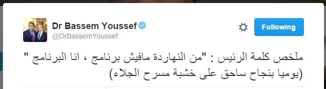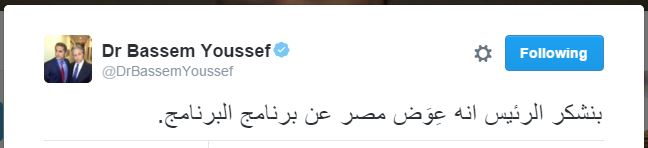ووجه يوسف في تعليق ساخر له عبر حسابه الشخصي بموقع التغريدات القصيرة “تويتر” رسالة شكر إلى عبدالفتاح السيسي لأنه عوض مصر عن برنامج “البرنامج” في إشارة لبعض التصريحات التي أدلى بها السيسي واستقبلها نشطاء مواقع التواصل بموجه واسعة من السخرية والكوميديا.