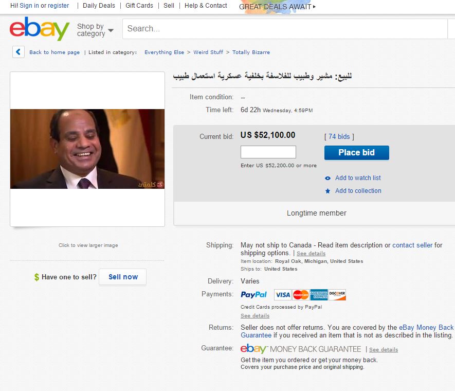 ووصف البائع السيسي بأنه مشير، وطبيب للفلاسفة، بخلفية عسكرية، وعرضه للبيع بأعلى سعر، ووصل مزاد البيع حتى الآن، إلى 52 ألف دولار أمريكي.