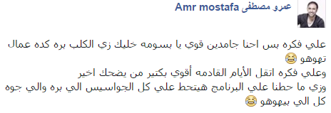 قال “مصطفى” -عبر “فيس بوك”-: “على فكرة بس إحنا جامدين قوي يا بسومة خليك زي الكلب بره كده عمال تهوهو”.