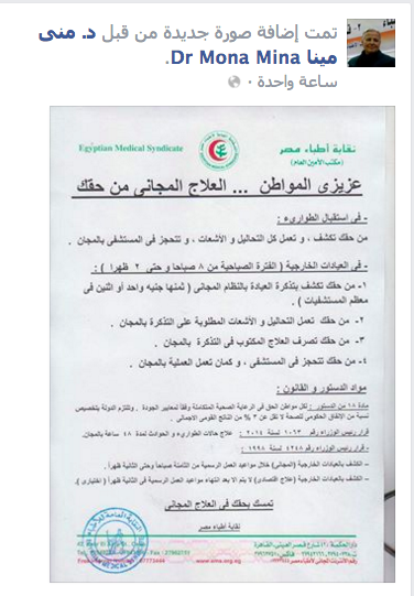 وقالت -في منشور لها تحت عنوان “عزيزي المواطن.. العلاج المجاني من حقك”-: “من حقك تكشف وتعمل كل التحاليل والأشعات وتتحجز في المستشفى بالمجان”.