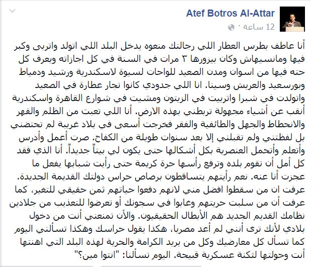 وقال -عبر منشور له على “فيس بوك”-: “أنا عاطف بطرس العطار اللي رجالتك منعوه يدخل البلد اللي اتولد واتربى وكبر فيها ومانسيهاش وكان بيزورها ٣ مرات في السنة في كل إجازاته ويعرف كل حتة فيها من أسوان ومدن الصعيد للواحات لسيوة لإسكندرية ورشيد ودمياط وبورسعيد والعريش وسينا”.