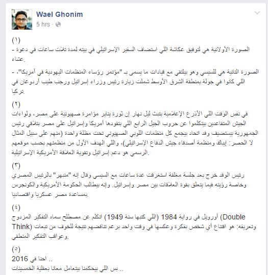 عقد الناشط السياسي وائل غنيم مقارنة بين تعامل الاعلام المصريـ مع لقاء البرلمانى توفيق عكاشة للسفير الاسرائيلى بالقاهرة، ولقاء السيسي لقادة المنظمات اليهودية الاميريكة.