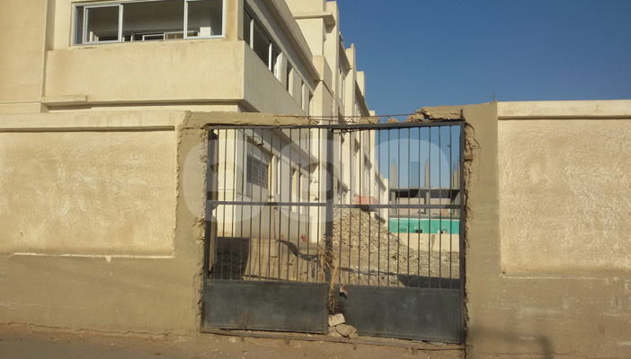 بالاقتراب من مبنى المستشفى، نجد بداخله أسوارا تحيط بحوائط خرسانية ناقصة البناء، بها فناء واسع ذو أرض متدحرجة تكسوها مخلفات البناء، ويتوسط الفناء بناية خاوية لم يكتمل تشطيبها، وكل هذا عليه باب حديدي مغلق بقفل.
