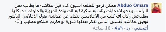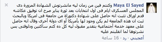“مايا السيد”: “وكنتم فين من زمان ليه مانشرتوش الشهادة المزورة دى المجلس العسكرى ايام فى اول انتخابات بعد ثورة يناير صرح ان توفيق عكاشة قدم أوراق تثبت إنه حاصل على شهادة دكتوراه من جامعة في أميركا وبالبحث ثبت أن هذه الجامعة لم يكن وجود لها بأمريكا أو اى دولة أخرى وقال انه حاصل على معهد خدمة أجتماعية بتقدير مقبول ليه كل ده كتم ساكتين ودلوقتى بس نشرتوها لما انقلبتم عليه”.