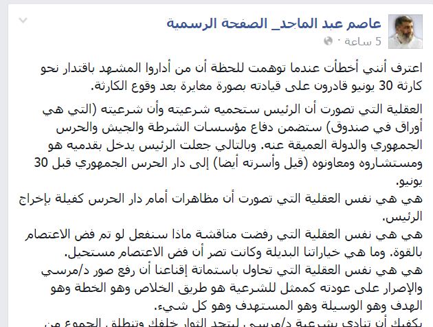 وقال -عبر منشور له على “فيس بوك”-: “أعترف أنني أخطأت عندما توهمت للحظة أن من أداروا المشهد باقتدار نحو كارثة 30 يونيو قادرون على قيادته بصورة مغايرة بعد وقوع الكارثة”.