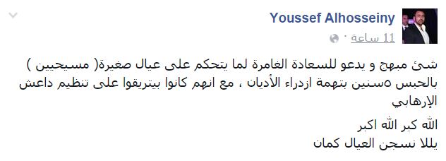 وقال -عبر منشور له على “فيس بوك”-: “شيء مبهج ويدعو للسعادة الغامرة، لما يتحكم على عيال صغيرة “مسيحيين” بالحبس 5 سنين بتهمة ازدراء الأديان، مع إنهم كانوا بيتريقوا على تنظيم داعش، الله أكبر، يلا نسجن العيال كمان”.